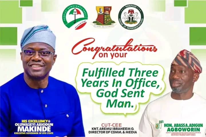 On behalf of the good people of Ibadan North-East/South-East federal constituency, Rep. Abass congratulate His Excellency, Engr. Seyi Makinde on this occasion and pray to God to strengthen GSM the most with good health for further development of our state, Pacesetter.