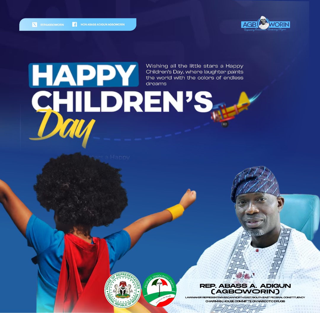 Lawmaker representing Ibadan North East/South East federal constituency in the House of Representatives, Rep. Abass Adigun (Agboworin), has extended warm greetings to children across the nation on the commemoration of this year’s Children’s Day.